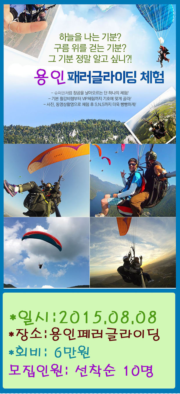** 낮에 타면 맑은 하늘에 코엑스, 남산타워, 수원, 동탄, 에버랜드를 보시는 것이 아름답고, 해가질 무렵엔 석양을 보면서 비행하는 것도 환상적입니다.(6년전..제주도에서 회원님들이 해가 질무렵에 탔을 때 노을진 석양에 둥둥 떠 있는 발간색 노란색 파란색들의 패러글라이딩이 참으로 예뻤던 것 같습니다.)